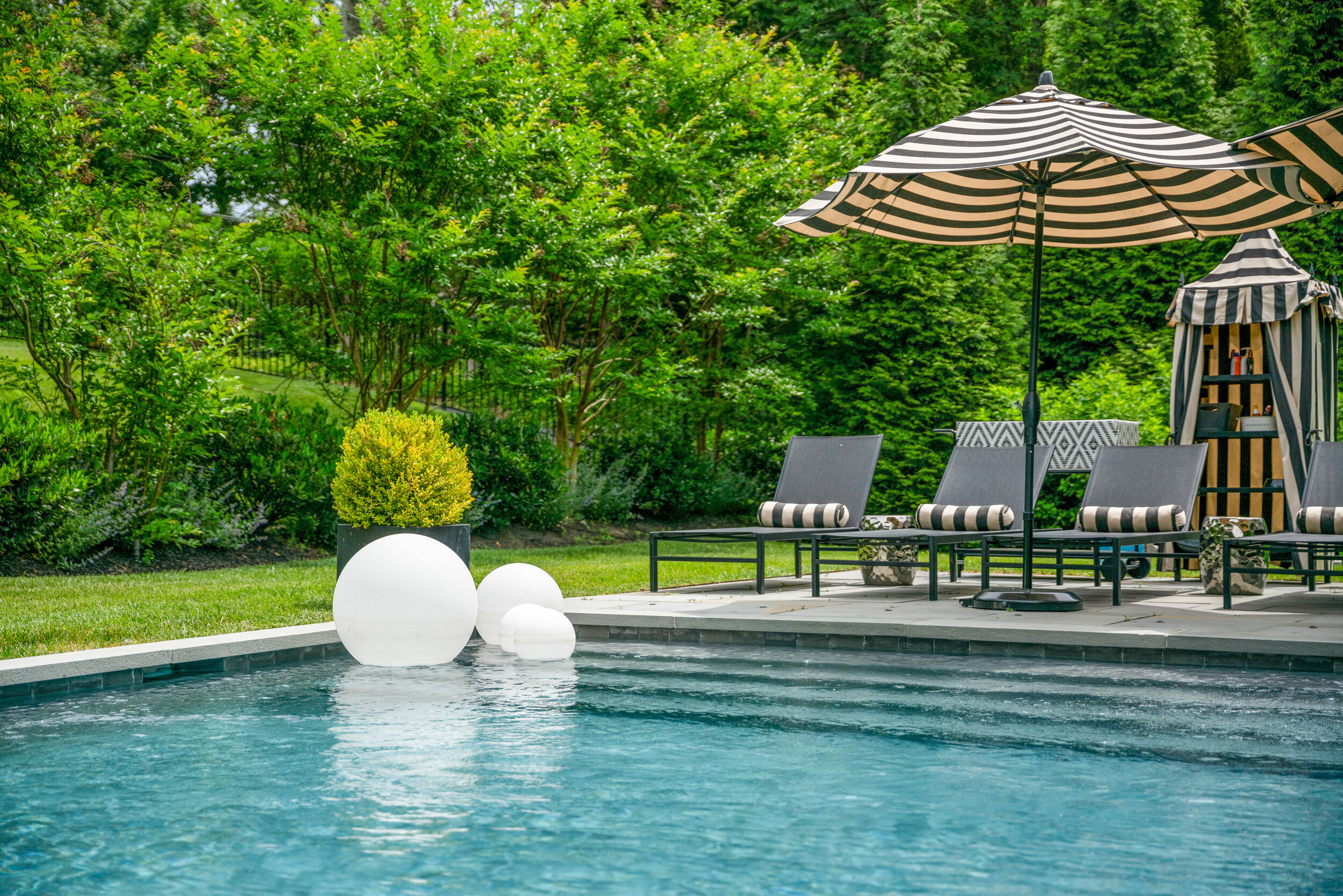 Saltwater in-ground pool with formal gardens and a lounge area